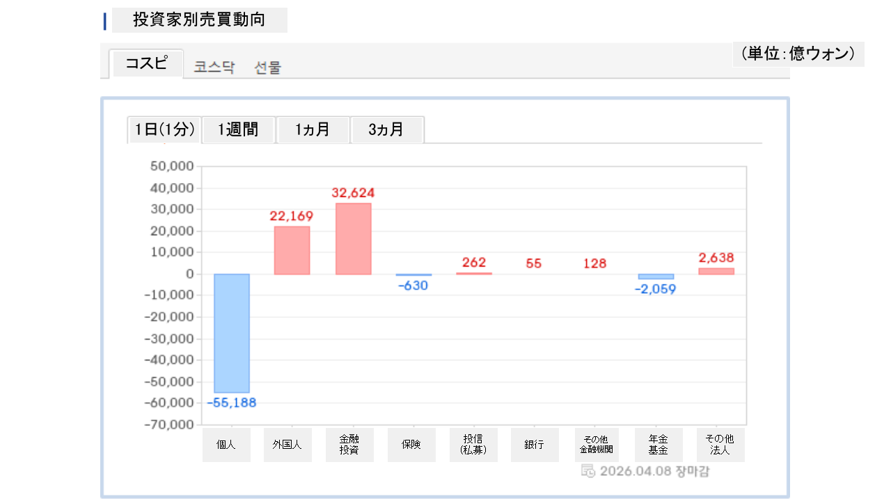 2026年04月09日(木)の韓国株式市場が開きました。10:01現在、KOSPI(韓国総合株価指数)のチャートは以下のようになっています(チャートは『Investing.com』より引用)。投資家別売買動向は以下です。⇒データ引用元:『f...