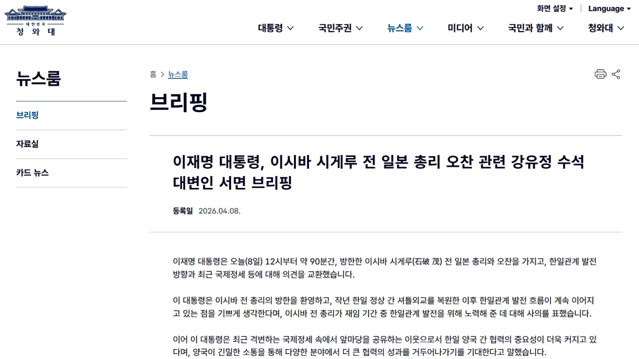 青瓦台首席報道官 カン・ユジョン⇒参照・引用元:『韓国 大統領府』公式サイト「이재명 대통령, 이시바 시게루 전 일본 총리 오찬 관련 강유정 수석대변인 서면 브리핑」