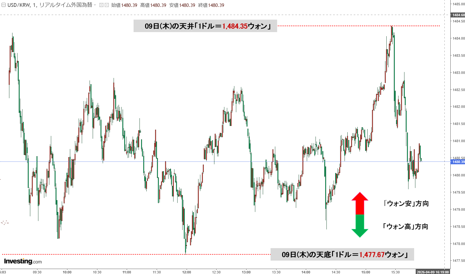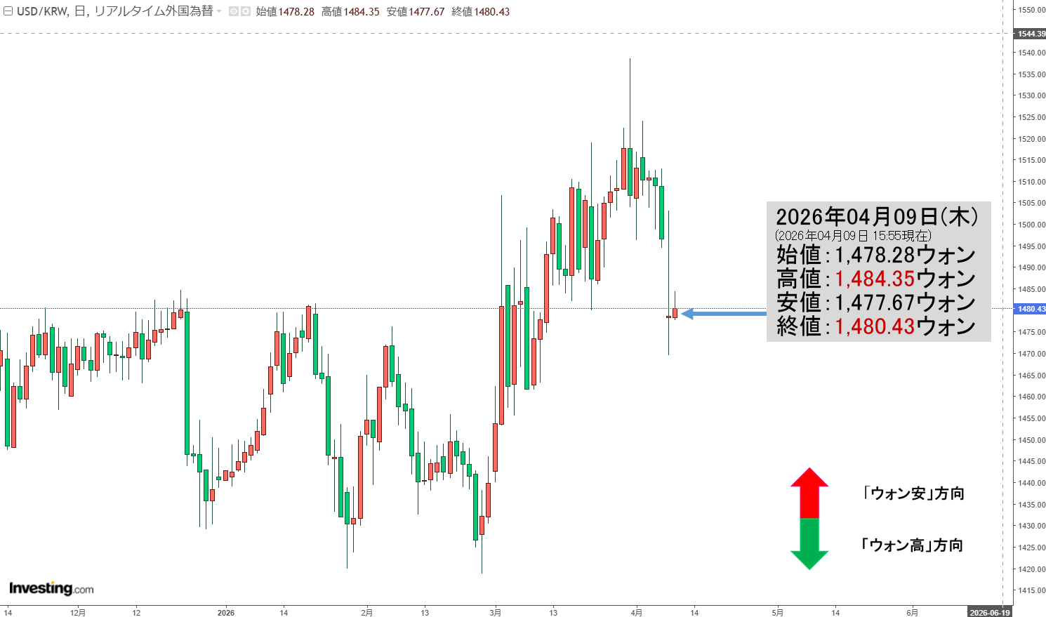 現在のところ「1ドル=1,480ウォン」近辺の攻防となっています。