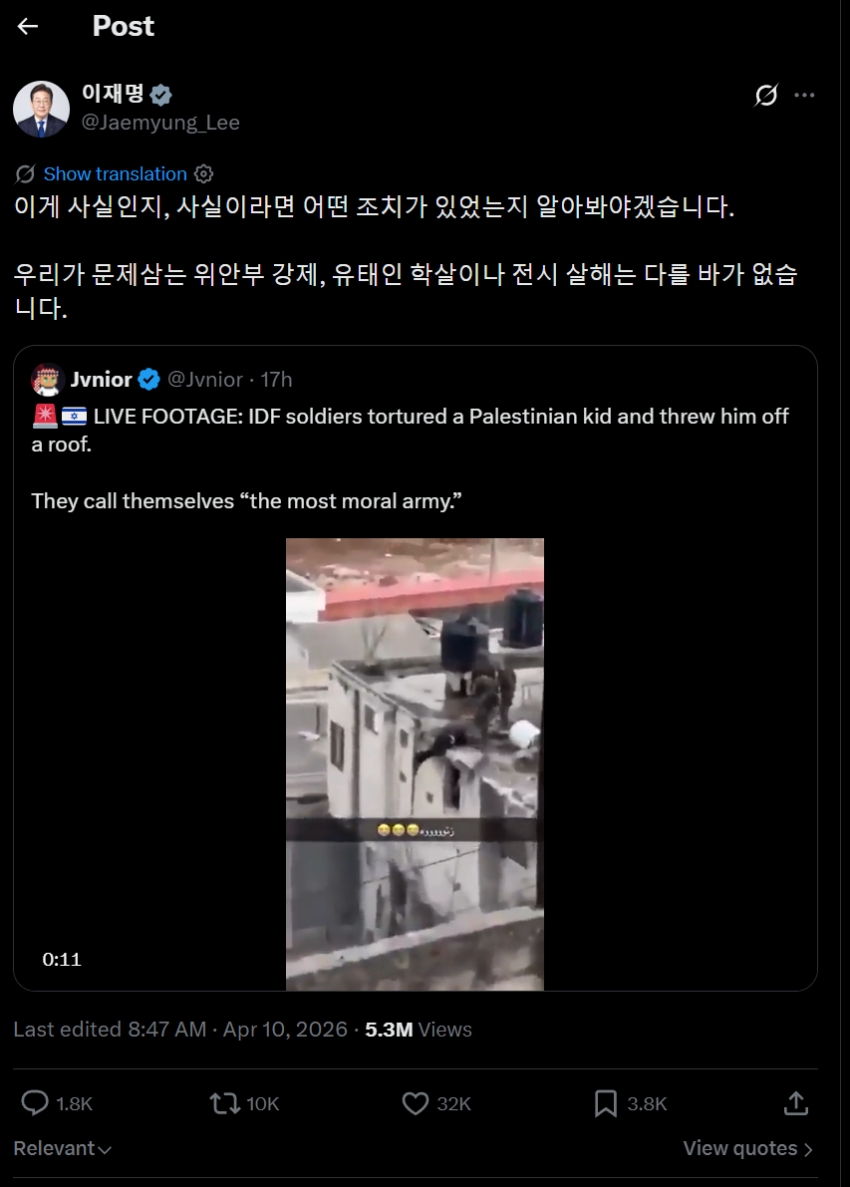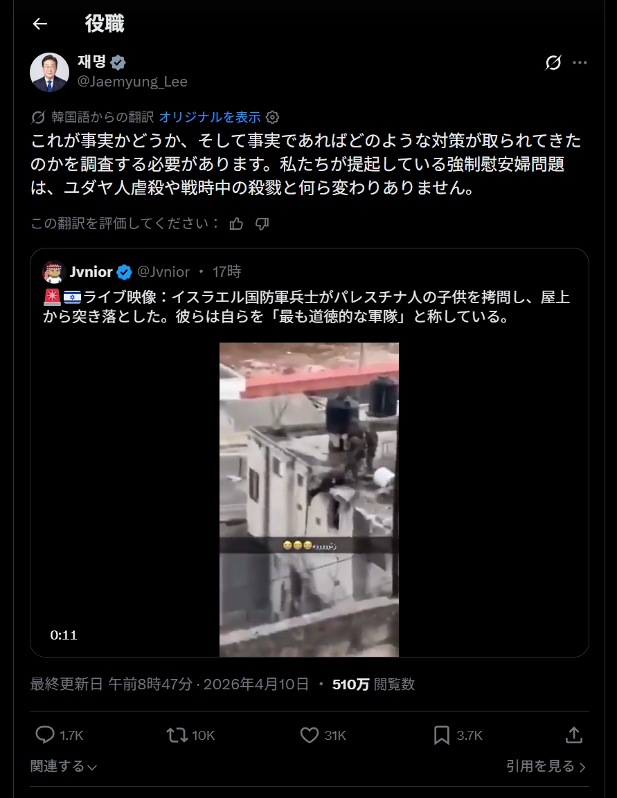 2026年04月10日、韓国大統領に成りおおせた李在明(イ・ジェミョン)さんが自身の『X』アカウントにバカ過ぎる投稿を行いました。