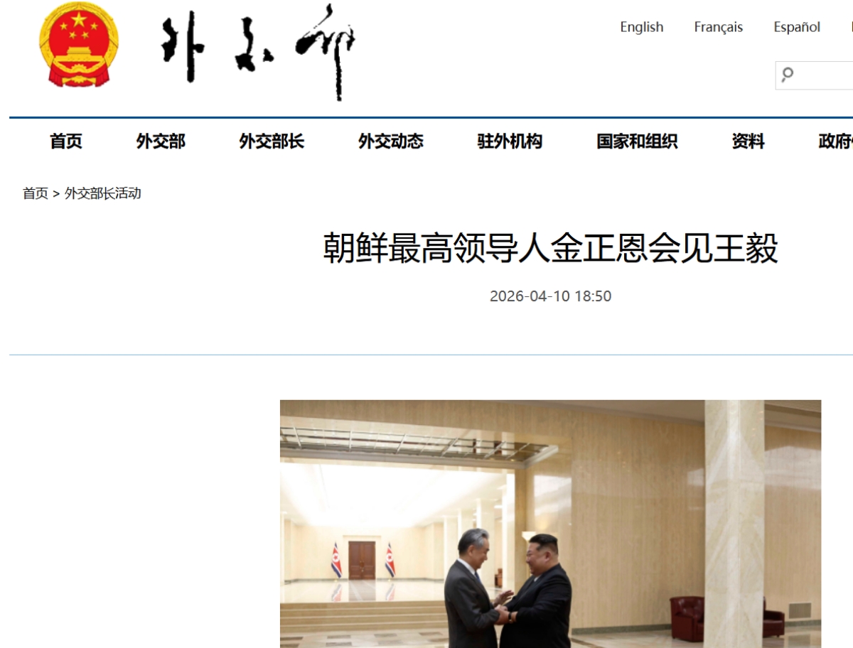 現地時間2026年04月10日、朝鮮労働党総書記・国務委員会委員長の金正恩は、平壌の朝鮮労働党中央本部において、中国共産党中央政治局委員・外交部長の王毅と会見した。