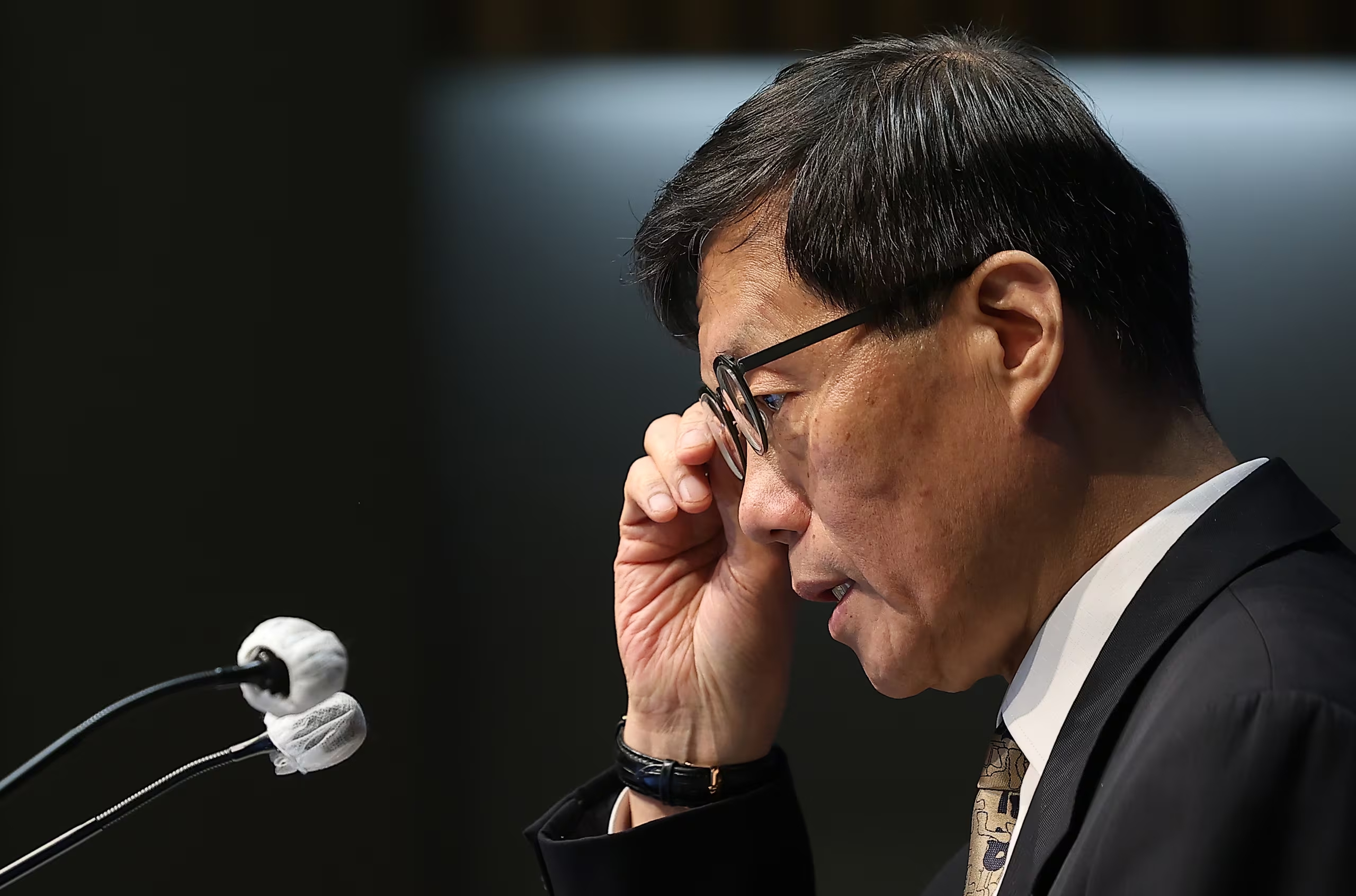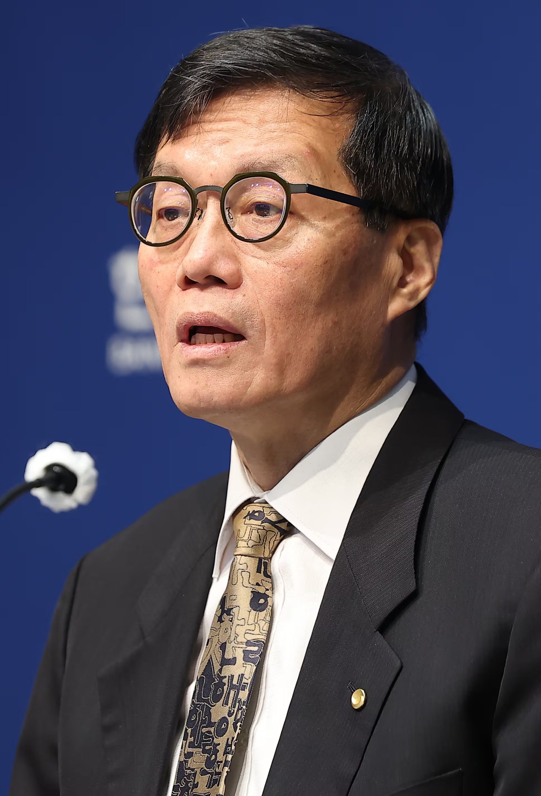 ↑2026年04月10日の金融通貨委員会後の記者懇談会。李昌鏞(イ・チャンヨン)総裁のネクタイはハングルの子音・母音が記された金色のネクタイでした。