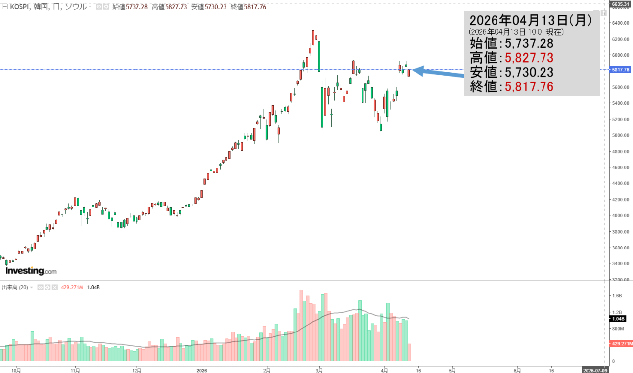 2026年04月13日(月)の韓国株式市場が開きました。10:01現在、KOSPI(韓国総合株価指数)のチャートは以下のようになっています(チャートは『Investing.com』より引用)。