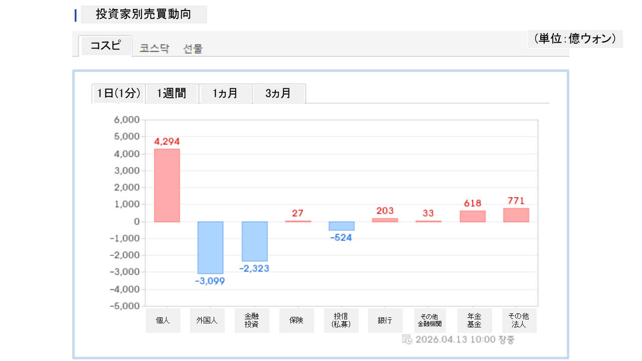 個人投資家は「4,294億ウォン」の買い越し、外国人投資家は「3,099億ウォン」の売り越しです。