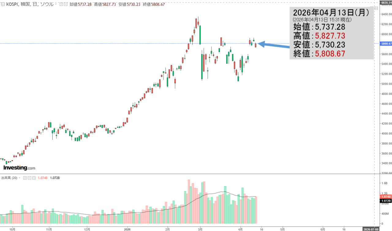2026年04月13日(月)の韓国株式市場が締まりました。15:31現在、KOSPI(韓国総合株価指数)のチャートは以下のようになっています(チャートは『Investing.com』より引用)。