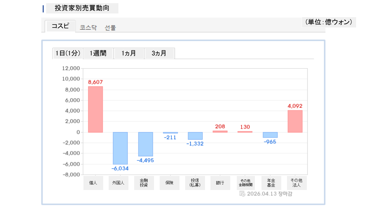 個人投資家は「8,607億ウォン」の買い越し、外国人投資家は「6,034億ウォン」の売り越しです。