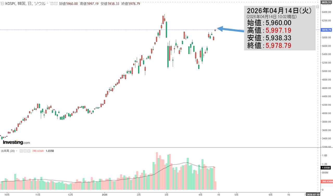 2026年04月14日(火)の韓国株式市場が開きました。10:02現在、KOSPI(韓国総合株価指数)のチャートは以下のようになっています(チャートは『Investing.com』より引用)。