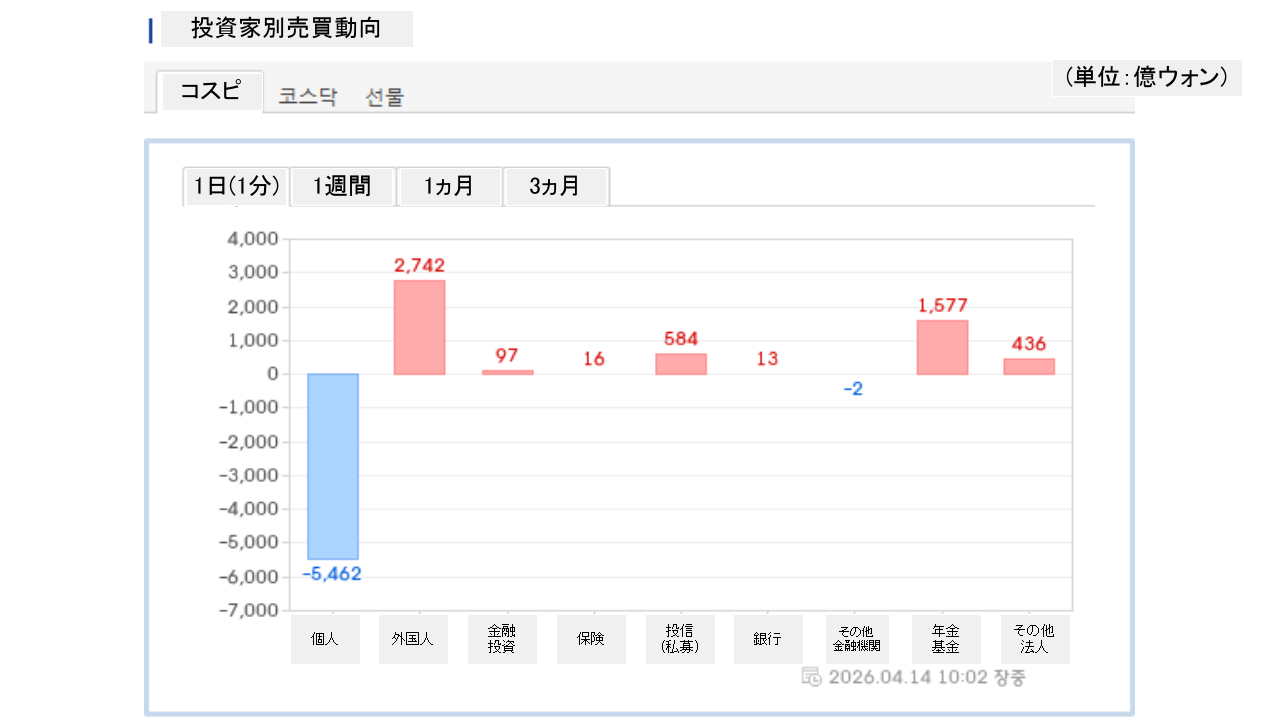 個人投資家は「5,462億ウォン」の売り越し、外国人投資家は「2,742億ウォン」の買い越しです。