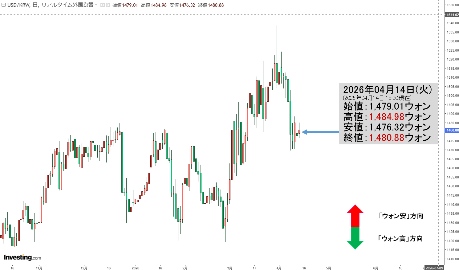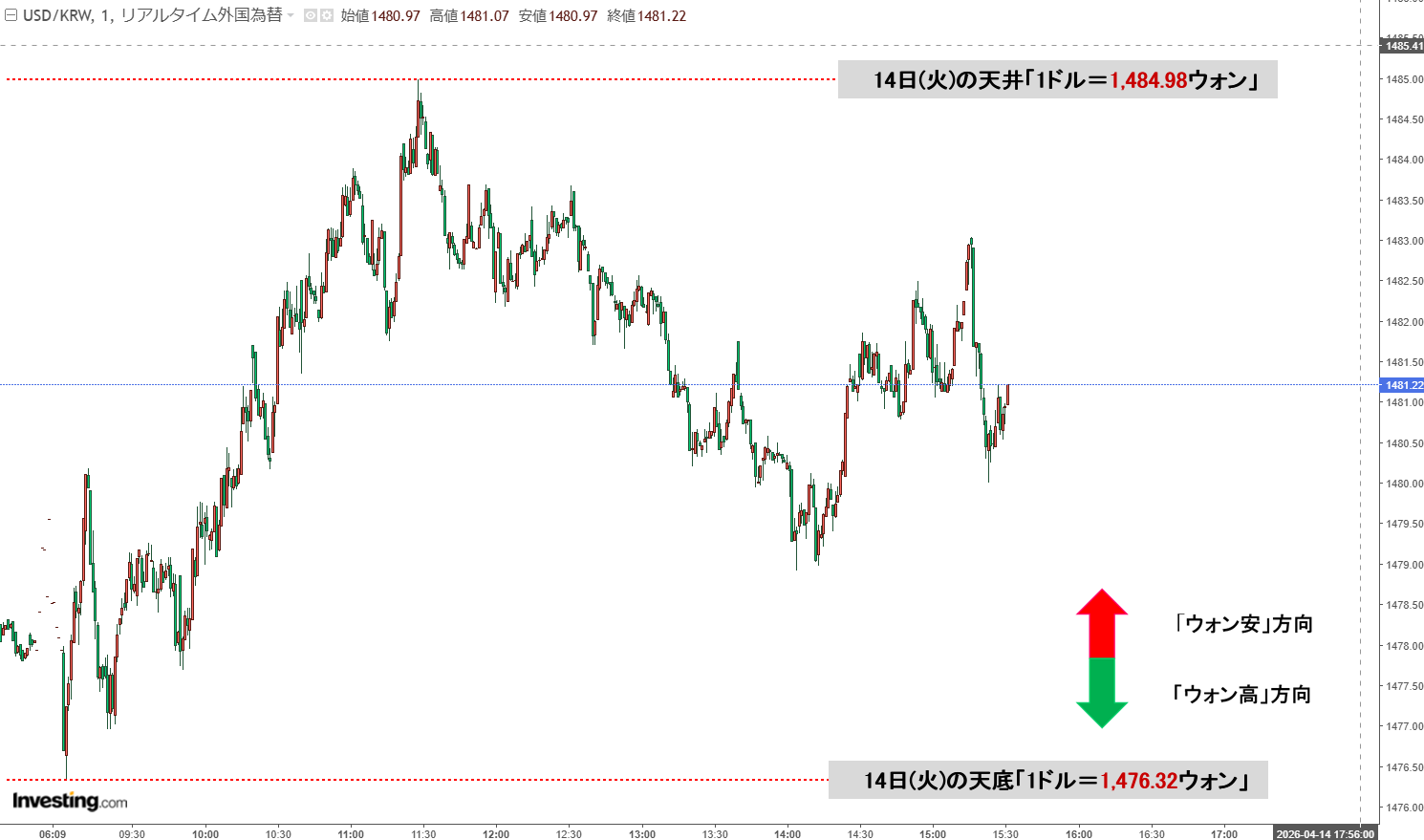 現在のところ、一応陽線です。「1ドル=1,480ウォン」近辺の攻防となっています。