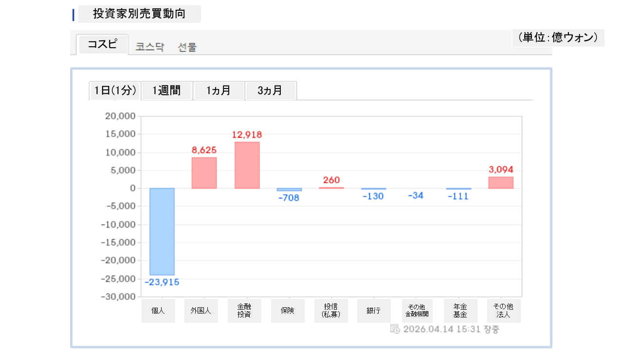 個人投資家は「2兆3,915億ウォン」の売り越し外国人投資家は「8,625億ウォン」の買い越しです。