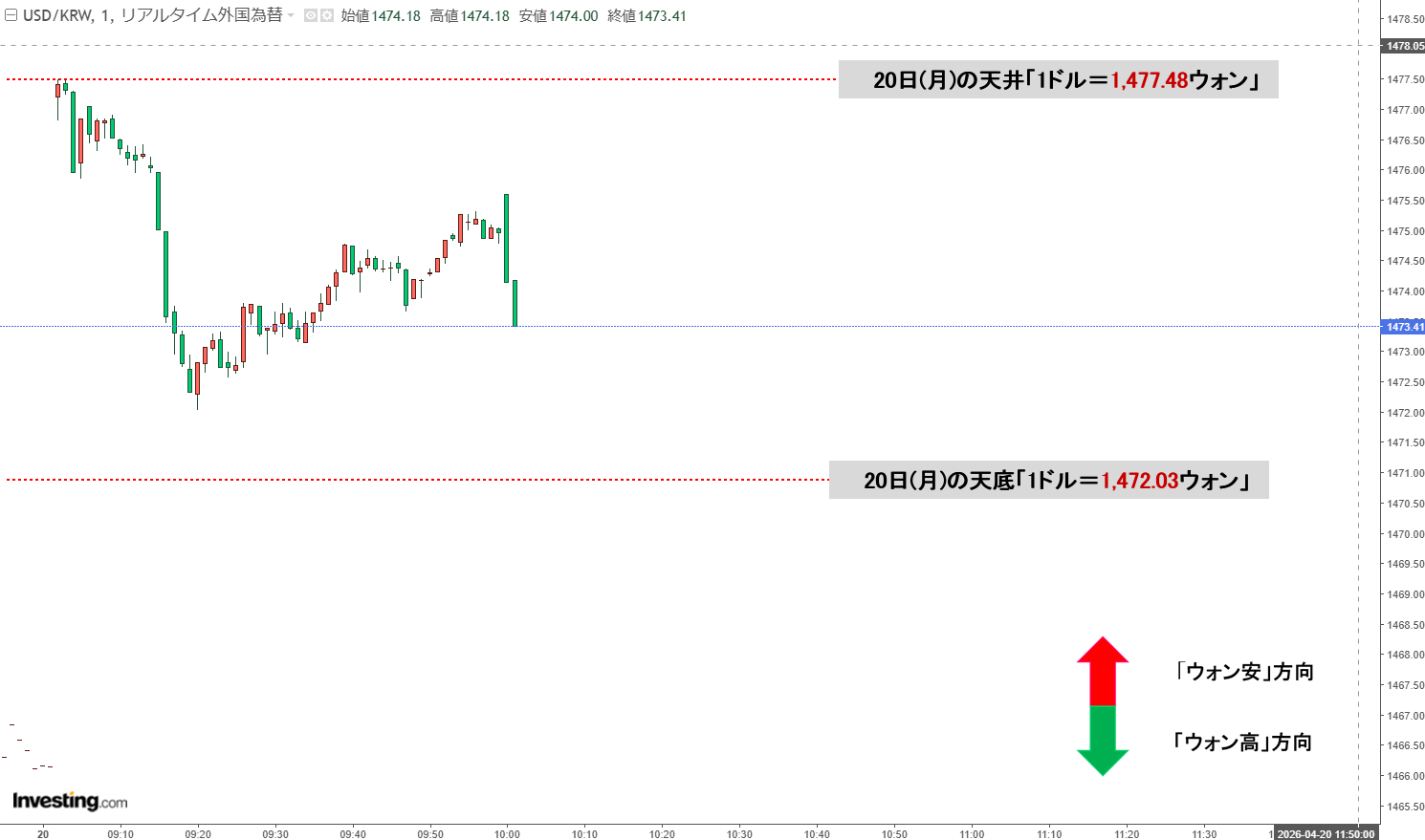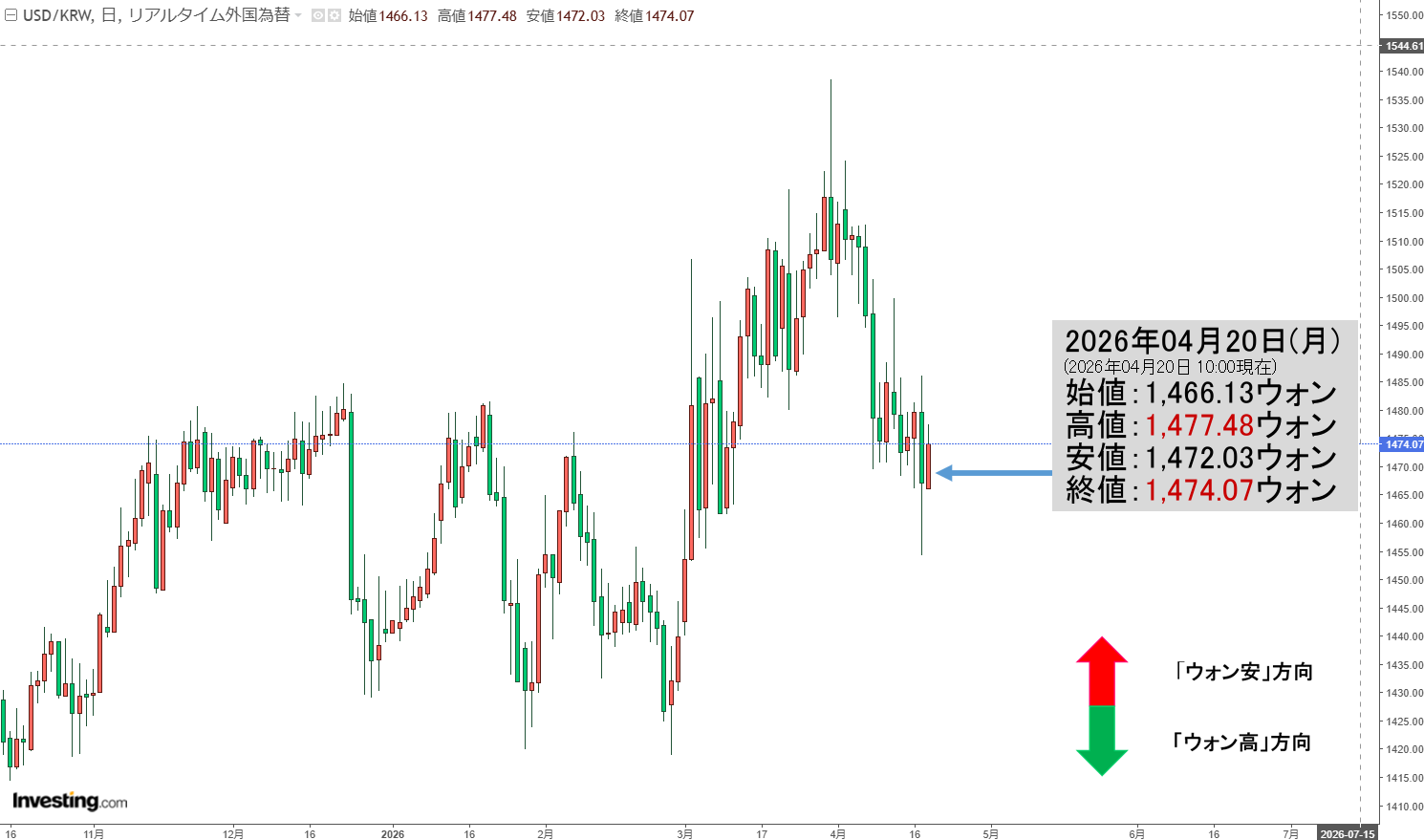 2026年04月20日(月)の市場が開きました。10:00現在、ドルウォンのチャートは以下のようになっています(チャートは『Investing.com』より引用)。