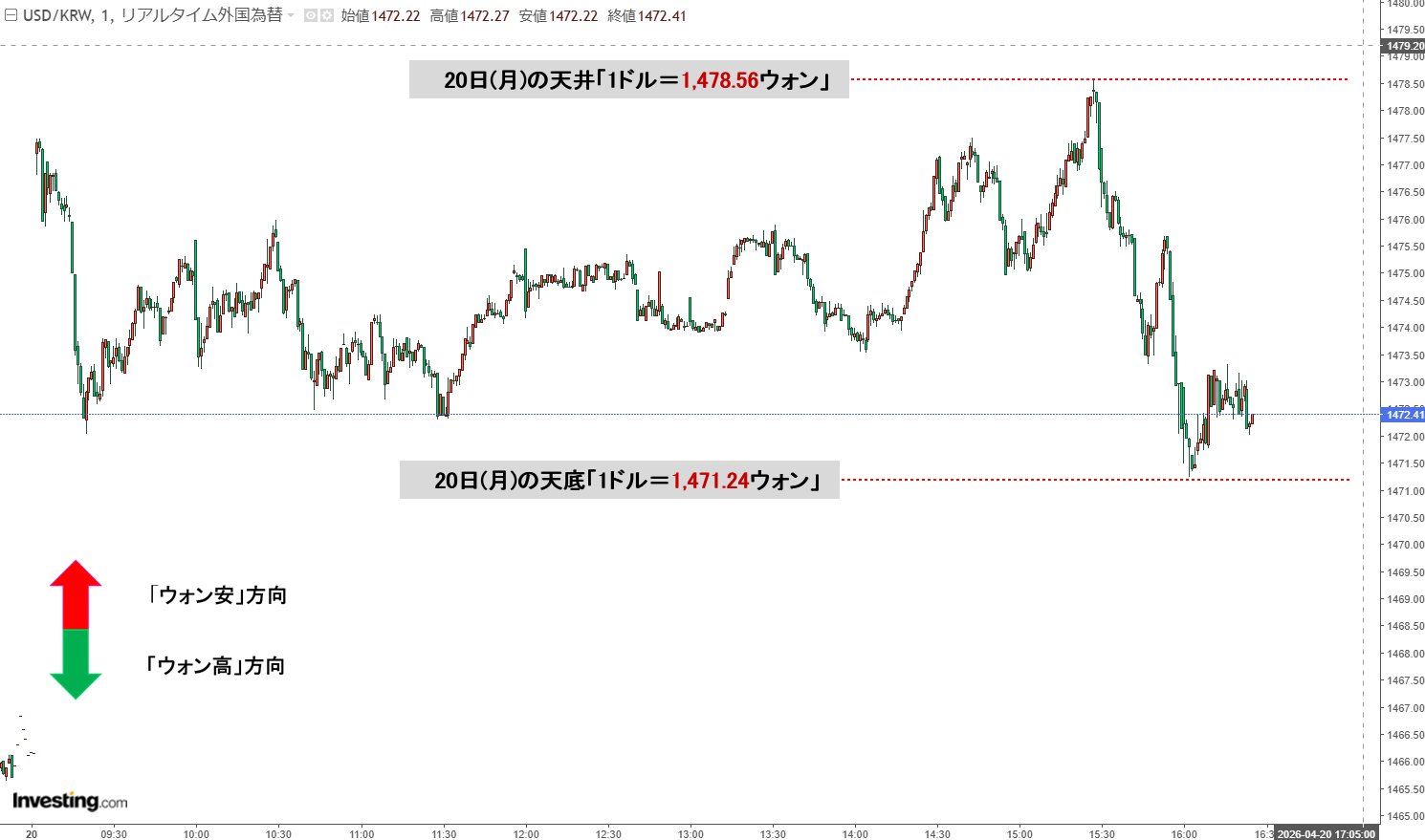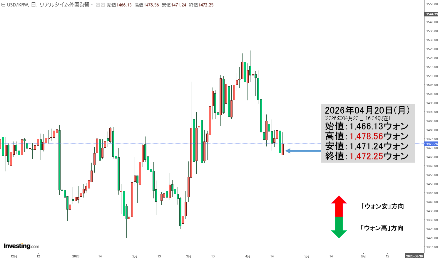 2026年04月20日(月)16:24現在、ドルウォンのチャートは以下のようになっています(チャートは『Investing.com』より引用)。