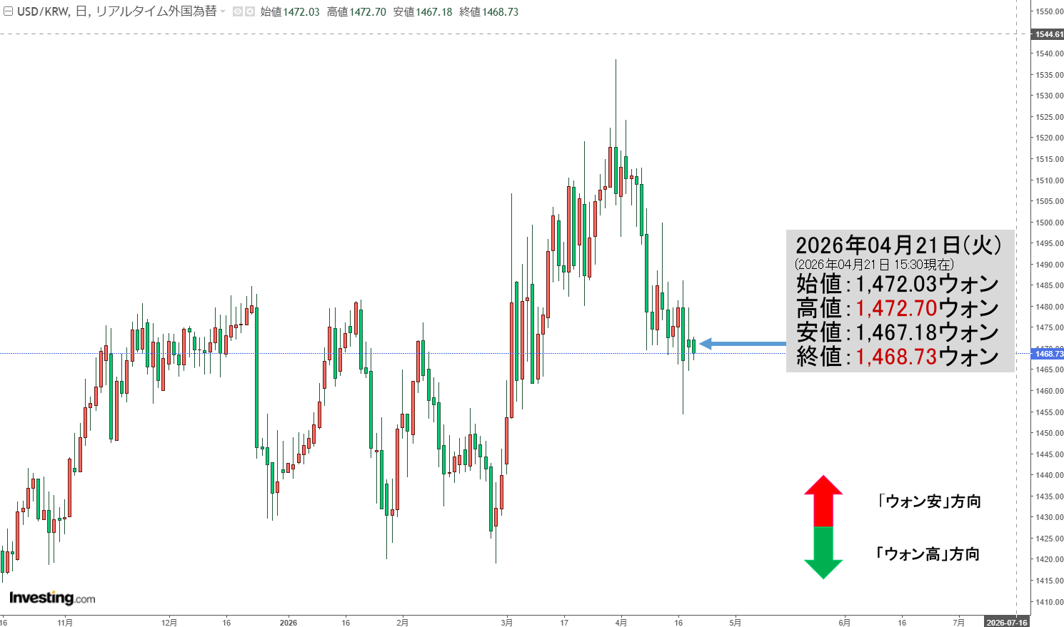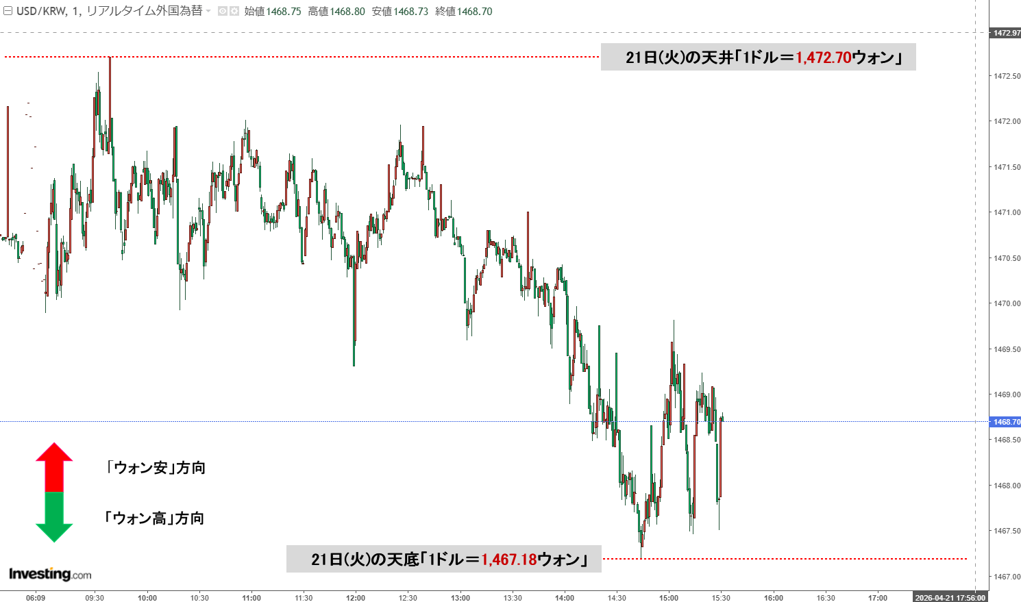 現在のところ「1ドル=1,468ウォン」近辺の攻防となっています。