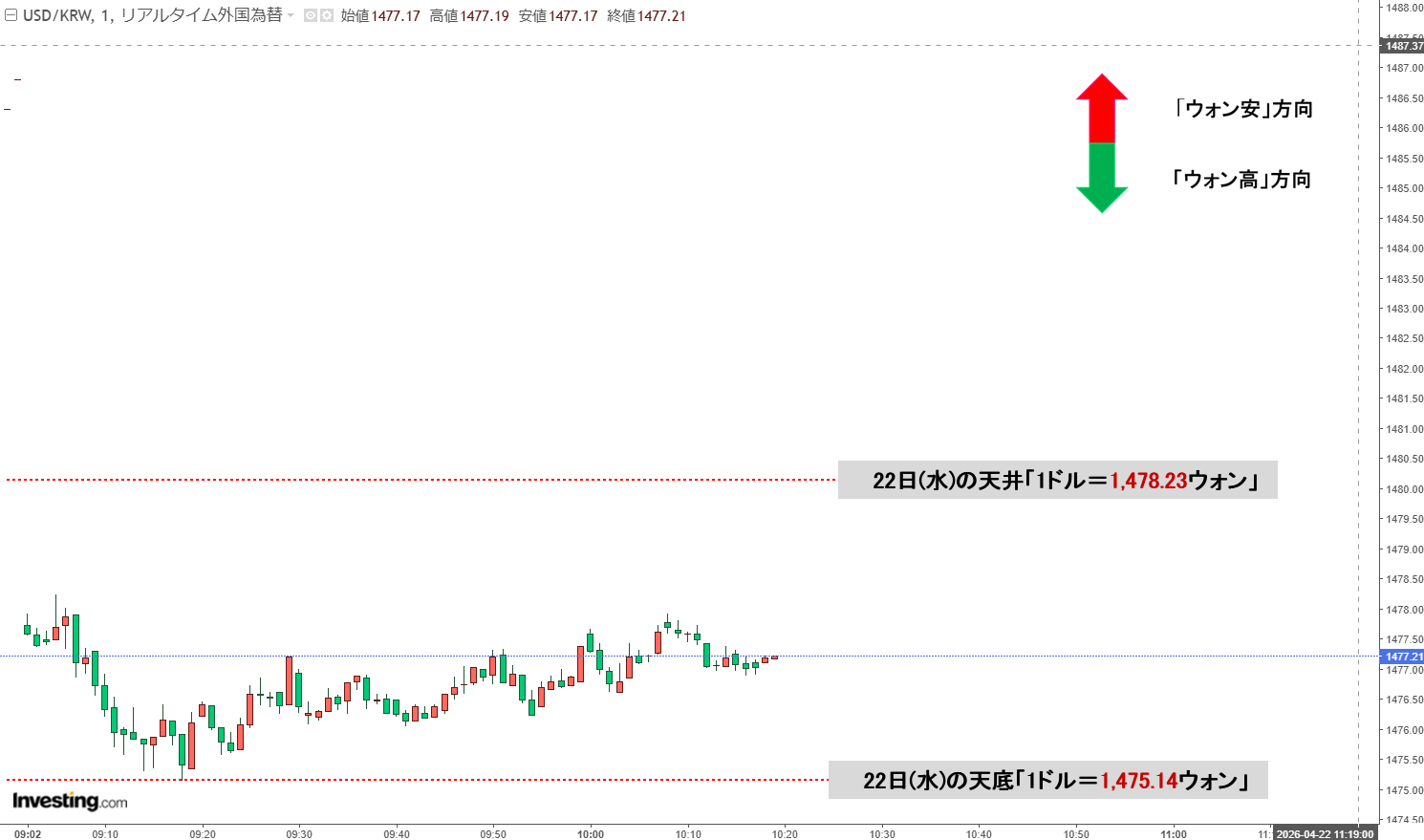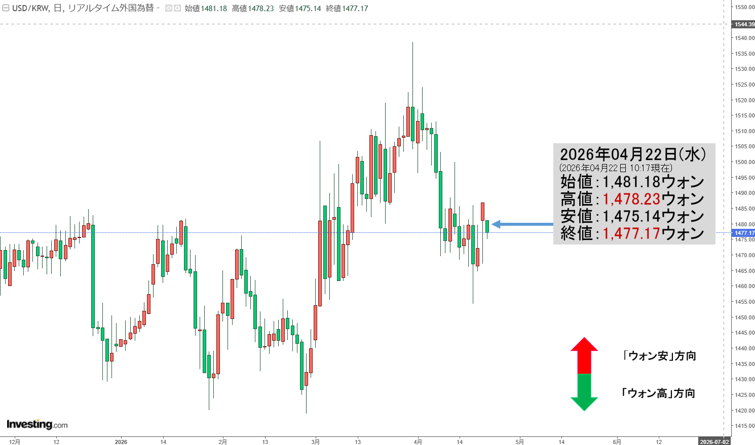 2026年04月22日(水)の市場が開きました。10:17現在、ドルウォンのチャートは以下のようになっています(チャートは『Investing.com』より引用)。