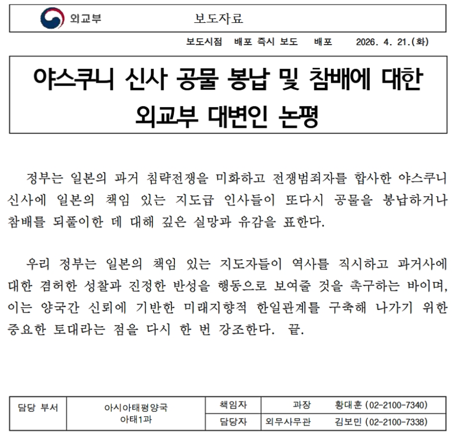 さっそく韓国外交部が以下のようなプレスリリースを出しました。短い文章なので、全文和訳します。