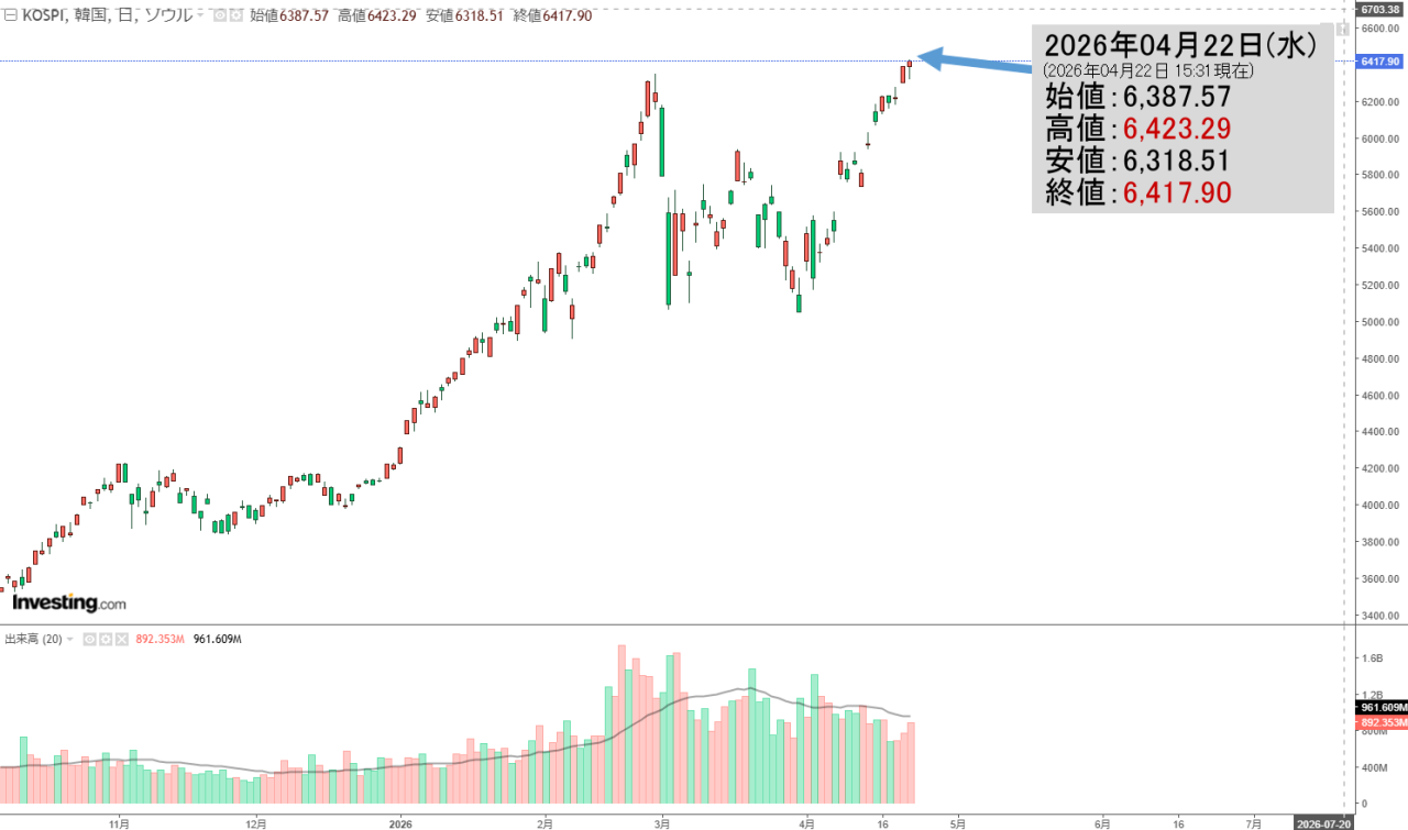 2026年04月22日(水)の韓国株式市場が締まりました。15:31現在、KOSPI(韓国総合株価指数)のチャートは以下のようになっています(チャートは『Investing.com』より引用)。