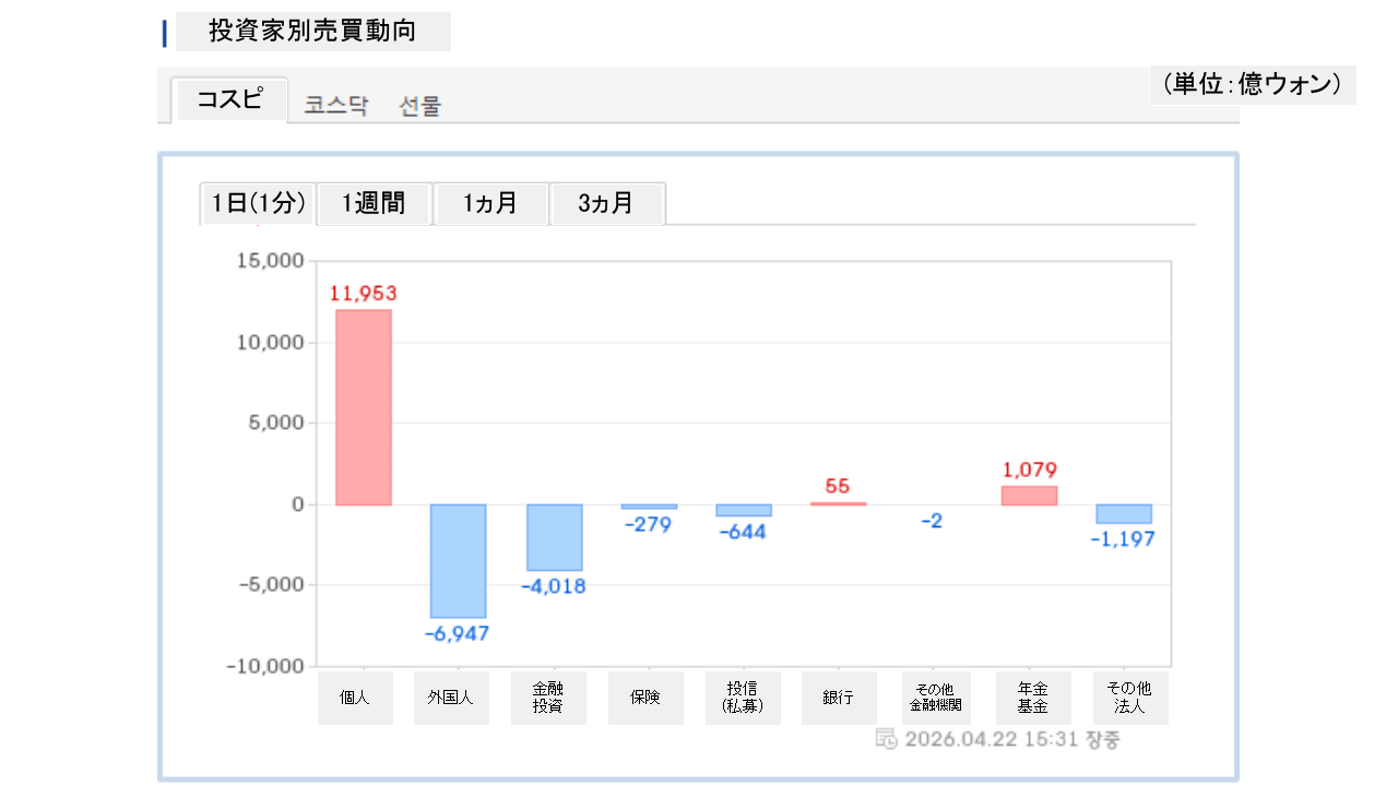 個人投資家は「1兆1,953億ウォン」の買い越し、外国人投資家は「6,947億ウォン」の売り越しです。
