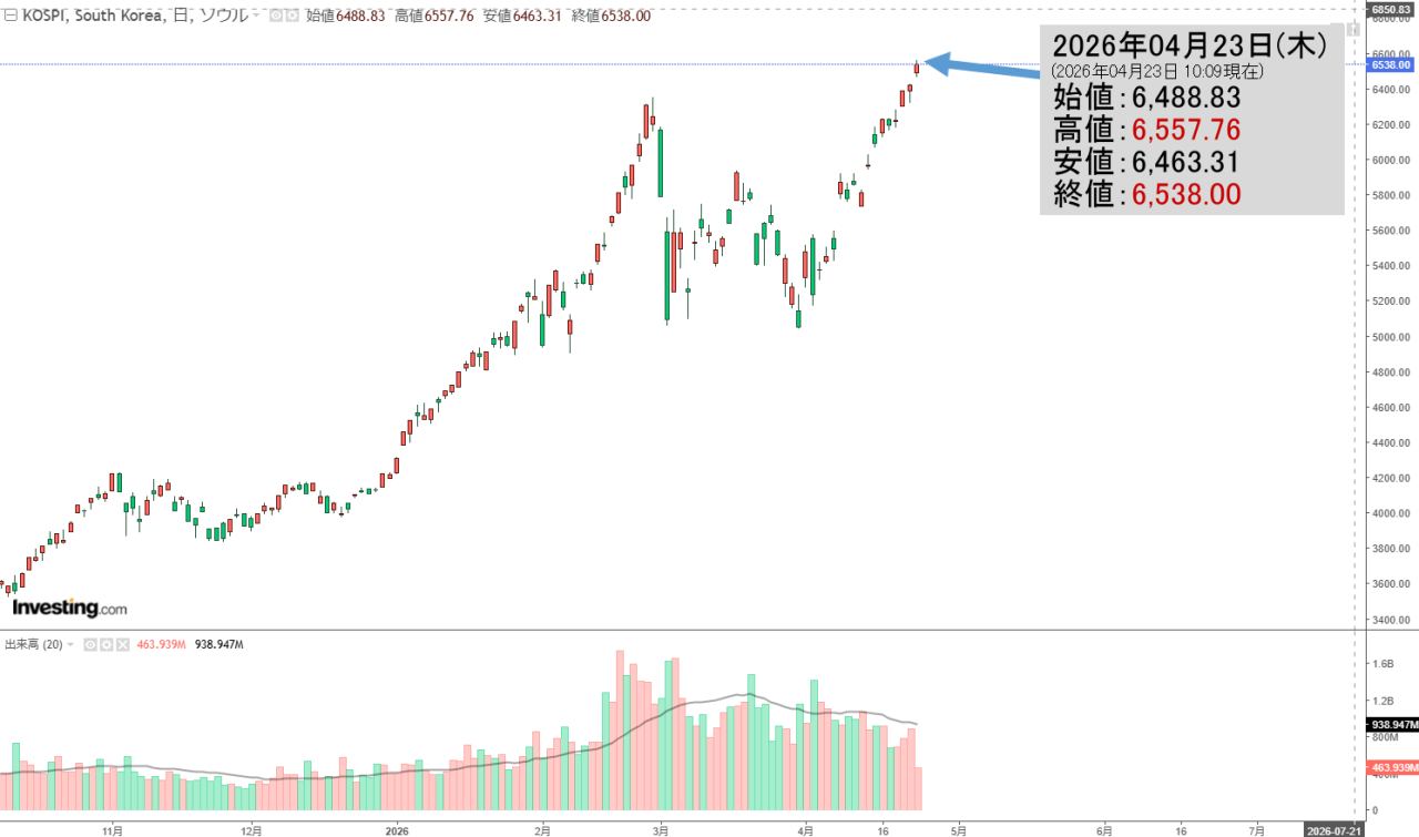 2026年04月23日(木)の韓国株式市場が開きました。10:09現在、KOSPI(韓国総合株価指数)のチャートは以下のようになっています(チャートは『Investing.com』より引用)。