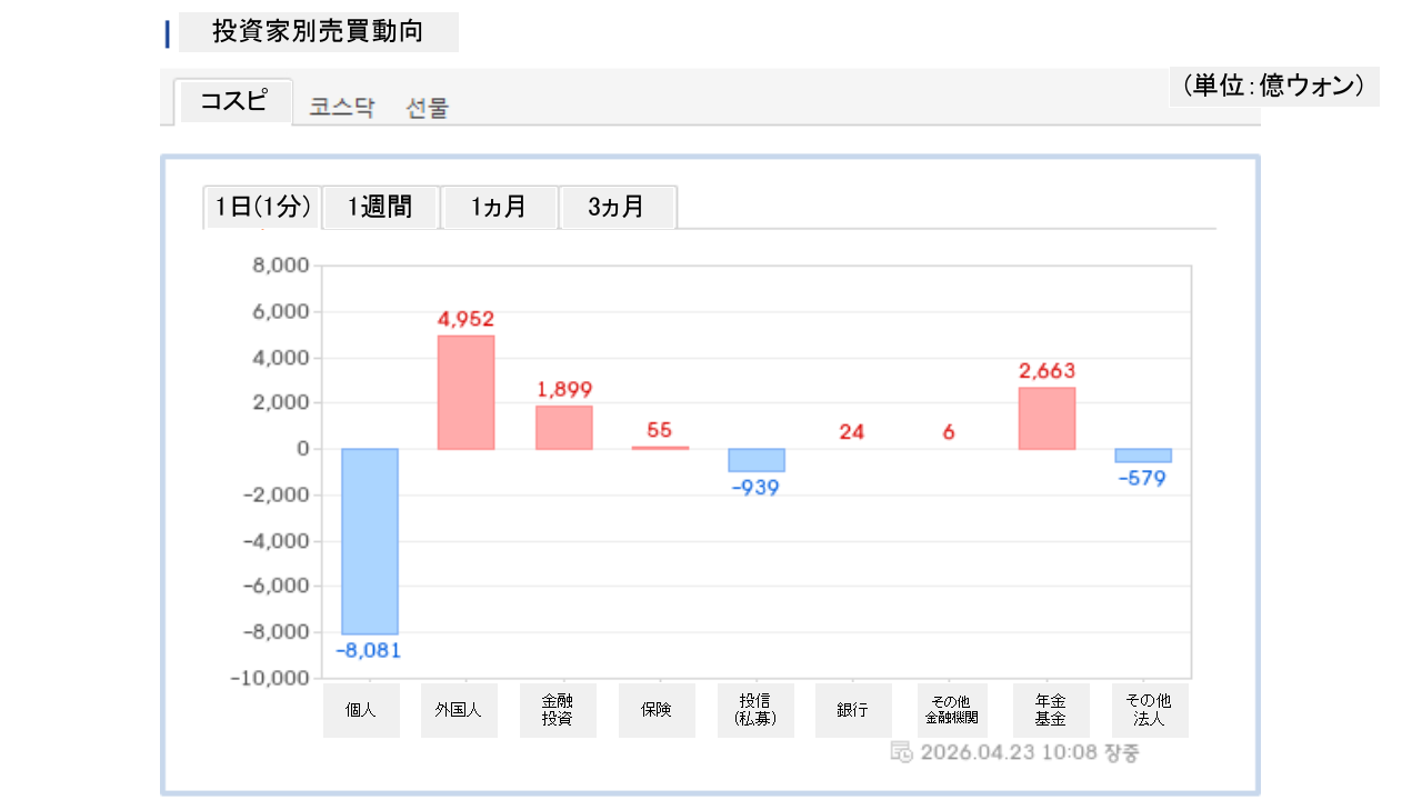 個人投資家は「8,081億ウォン」の売り越し、外国人投資家は「4,952億ウォン」の買い越しです。