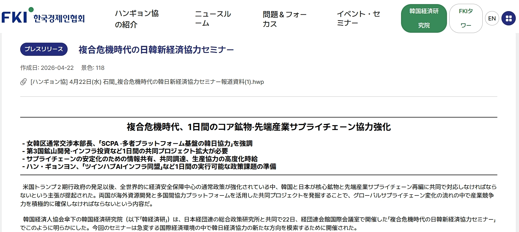 ⇒参照・引用元:『韓国経済人協会』公式サイト「복합위기 시대, 한 ‧ 일 핵심광물 ‧ 첨단산업 공급망 협력 강화해야」