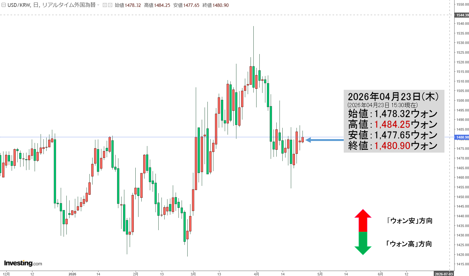 2026年04月23日(木)15:30現在、ドルウォンのチャートは以下のようになっています(チャートは『Investing.com』より引用)。