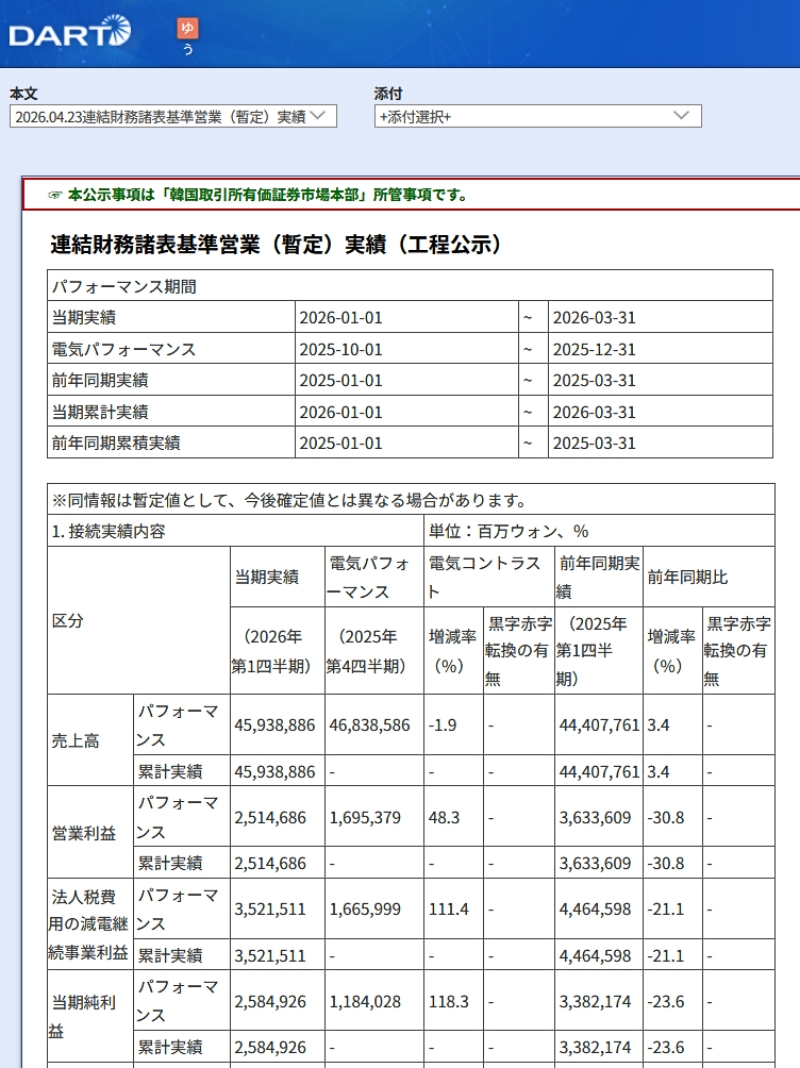 売上自体は「第1四半期」として見れば過去最大の実績ですが、営業利益は約2.5兆ウォンまで急減しました。