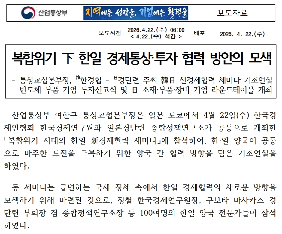- 半導体部品企業投資申告式および日素材・部品・装備企業ラウンドテーブル開催産業通商部の呂翰九(ヨ・ハング)通商交渉本部長は、日本・東京で04月22日(水)、韓国経済人協会韓国経済研究院と日本経団連総合政策研究所が共同で開催した「複合危機時代の韓日新経済協力セミナー」に出席し、日韓両国が共同で直面する挑戦を克服するための両国間協力の方向を盛り込んだ基調講演を行った。