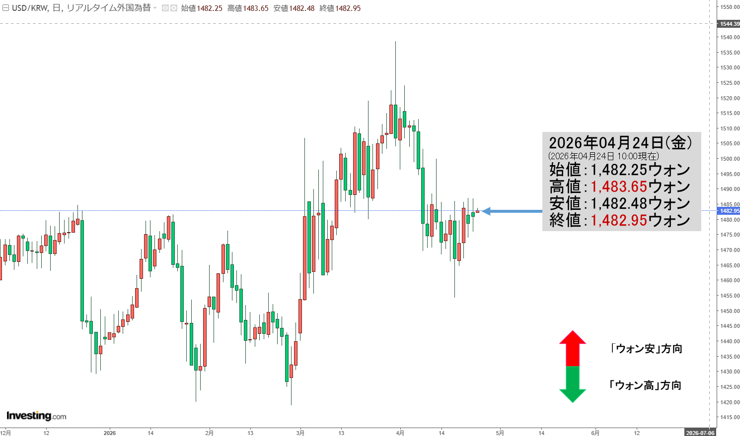 現在の天井は「1ドル=1,483.65ウォン」、天底は「1ドル=1,482.48ウォン」です。