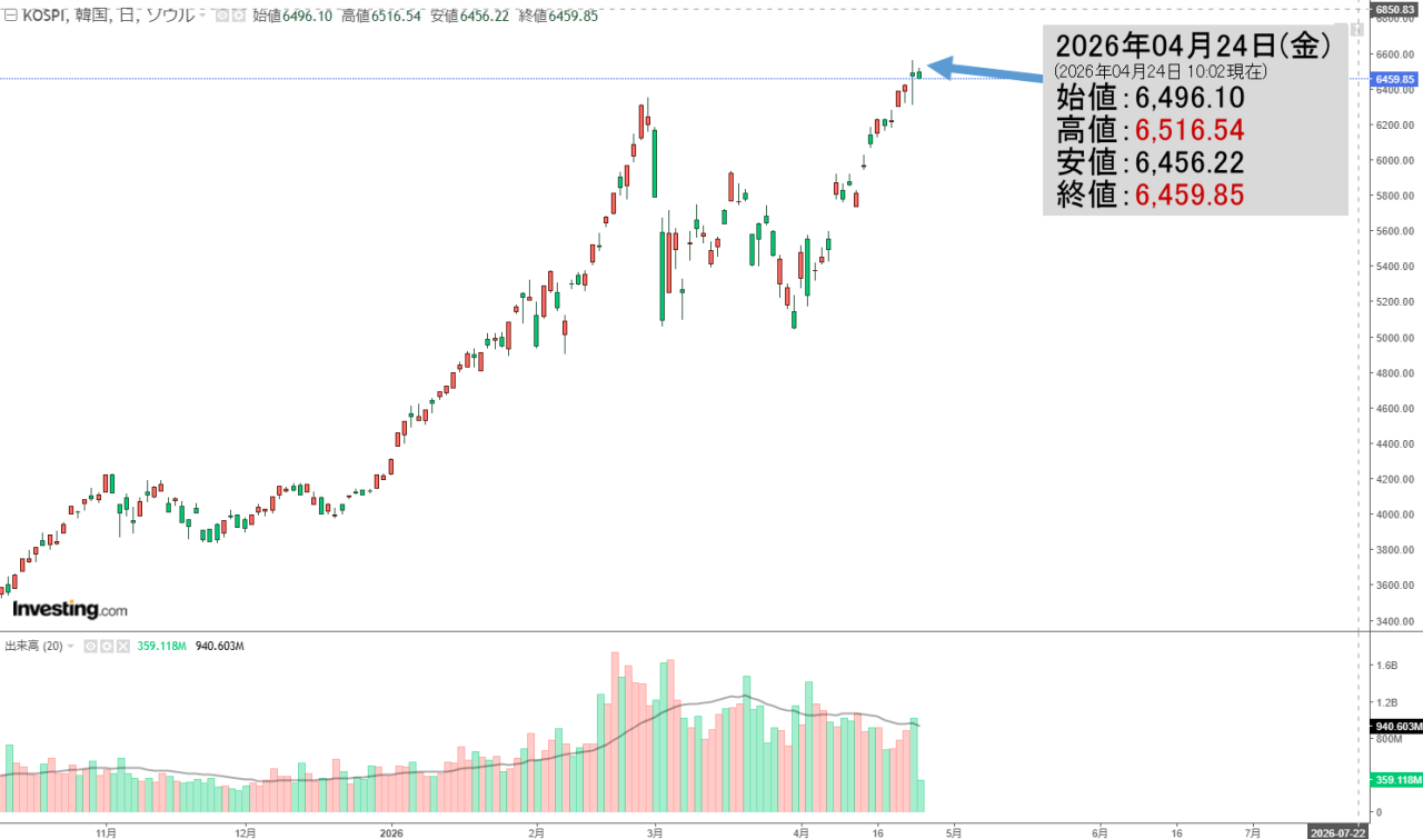 2026年04月24日(金)の韓国株式市場が開きました。10:02現在、KOSPI(韓国総合株価指数)のチャートは以下のようになっています(チャートは『Investing.com』より引用)。