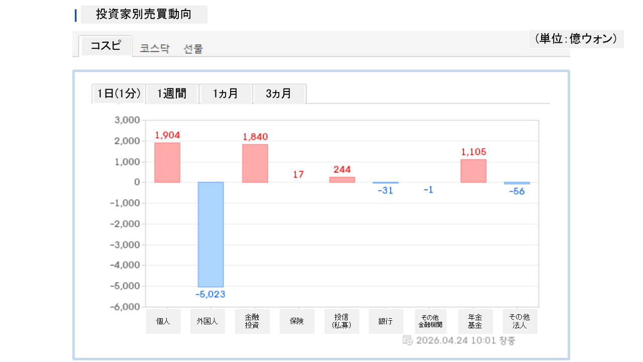 個人投資家は「1,904億ウォン」の買い越し、外国人投資家は「5,023億ウォン」の売り越しです。