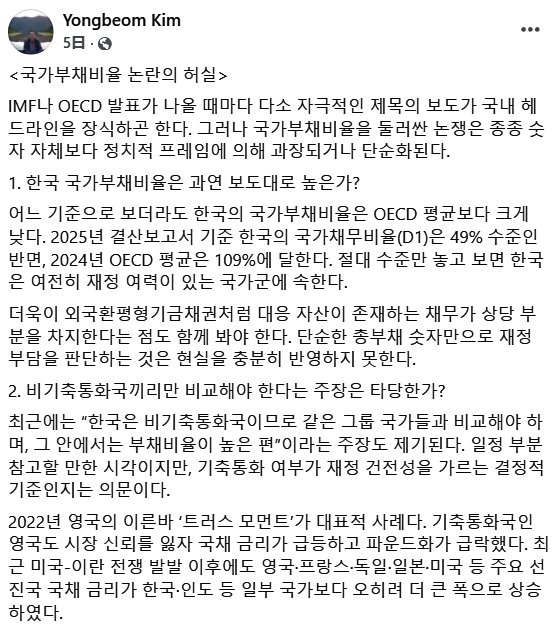 もちろん高齢化と福祉需要の増加によって長期的な負担は増える可能性がある。しかし短期的な流れだけを見て「韓国の債務が最も危険だ」と断定するのは難しい。