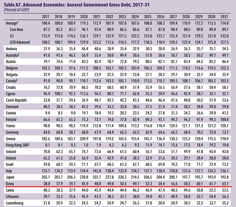 ↑『IMF』の「Fiscal Monitor 2026 April」の中にある各国政府負債対GDP比の表組。赤いアンダーラインが韓国。