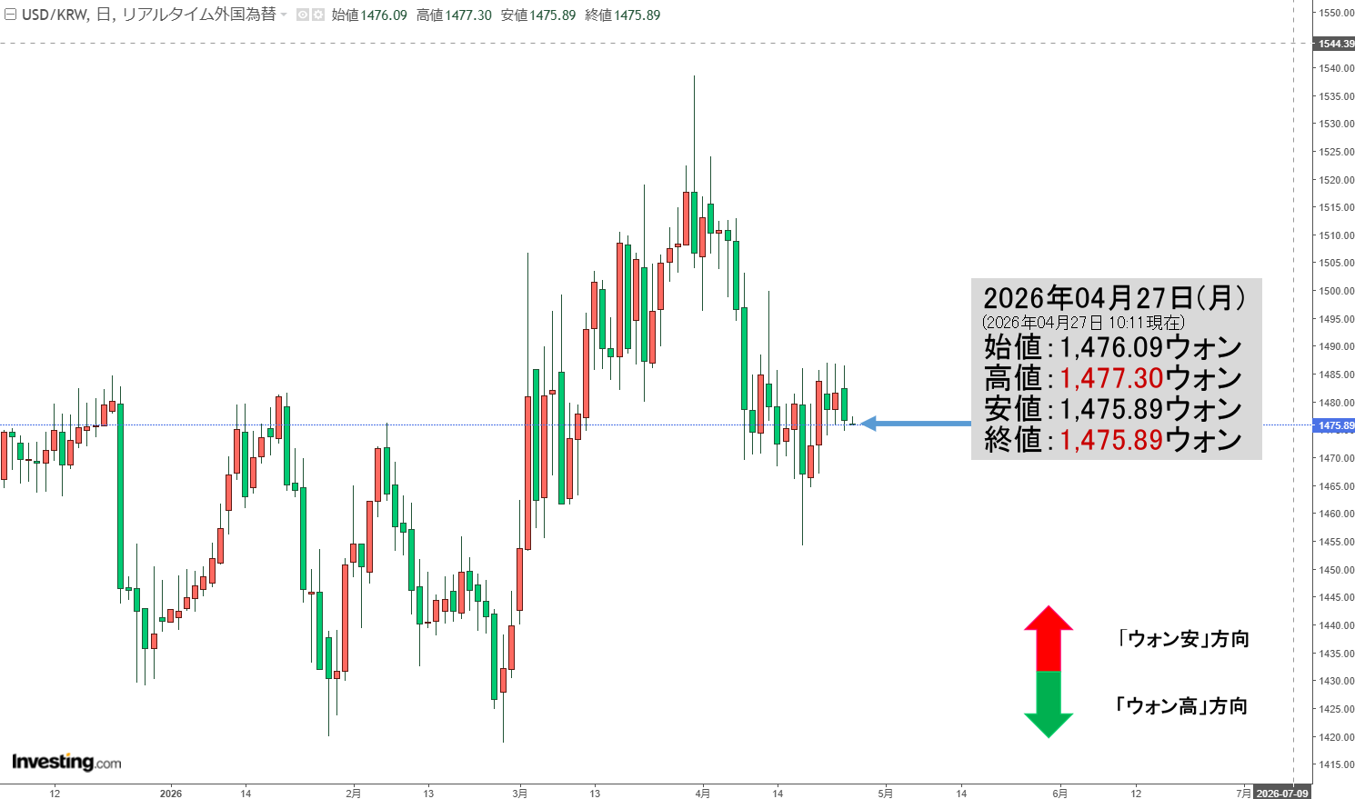 2026年04月27日(月)の市場が開きました。10:11現在、ドルウォンのチャートは以下のようになっています(チャートは『Investing.com』より引用)。