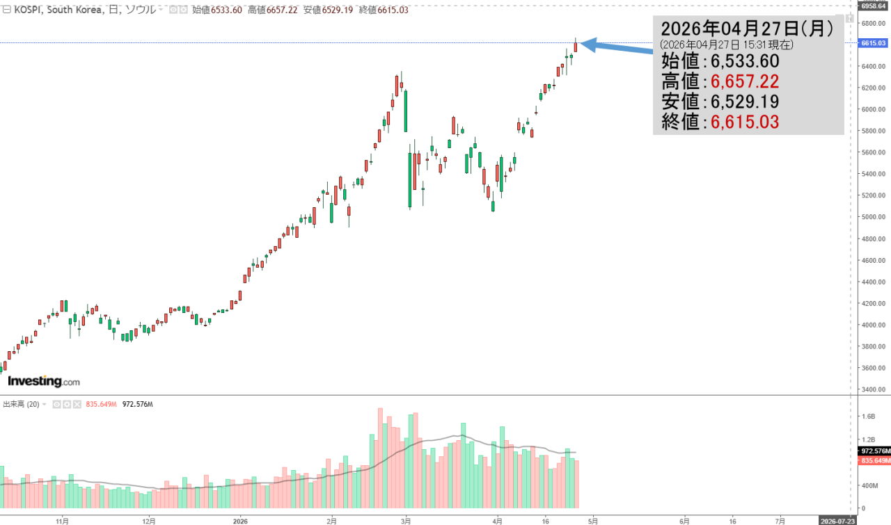 2026年04月27日(月)の韓国株式市場が締まりました。15:31現在、KOSPI(韓国総合株価指数)のチャートは以下のようになっています(チャートは『Investing.com』より引用)。