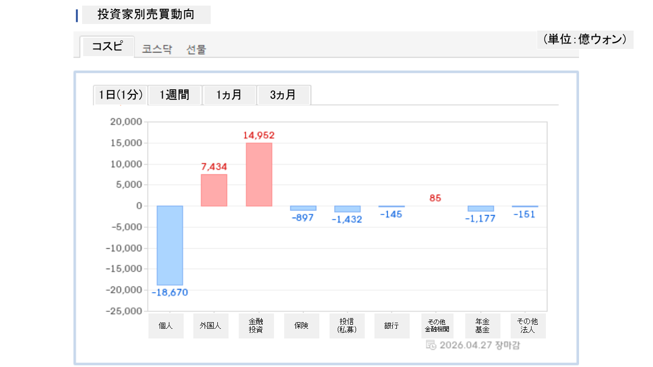 個人投資家は「1兆8,670億ウォン」の売り越し、外国人投資家は「7,434億ウォン」の買い越しです。