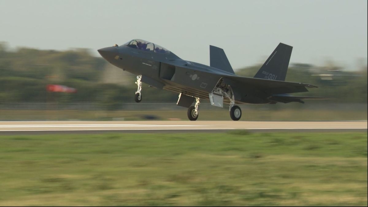 ↑03月25日の出庫式の後、2026年04月15日に離陸するKF-21量産1号機。韓国空軍第3訓練飛行団にて。