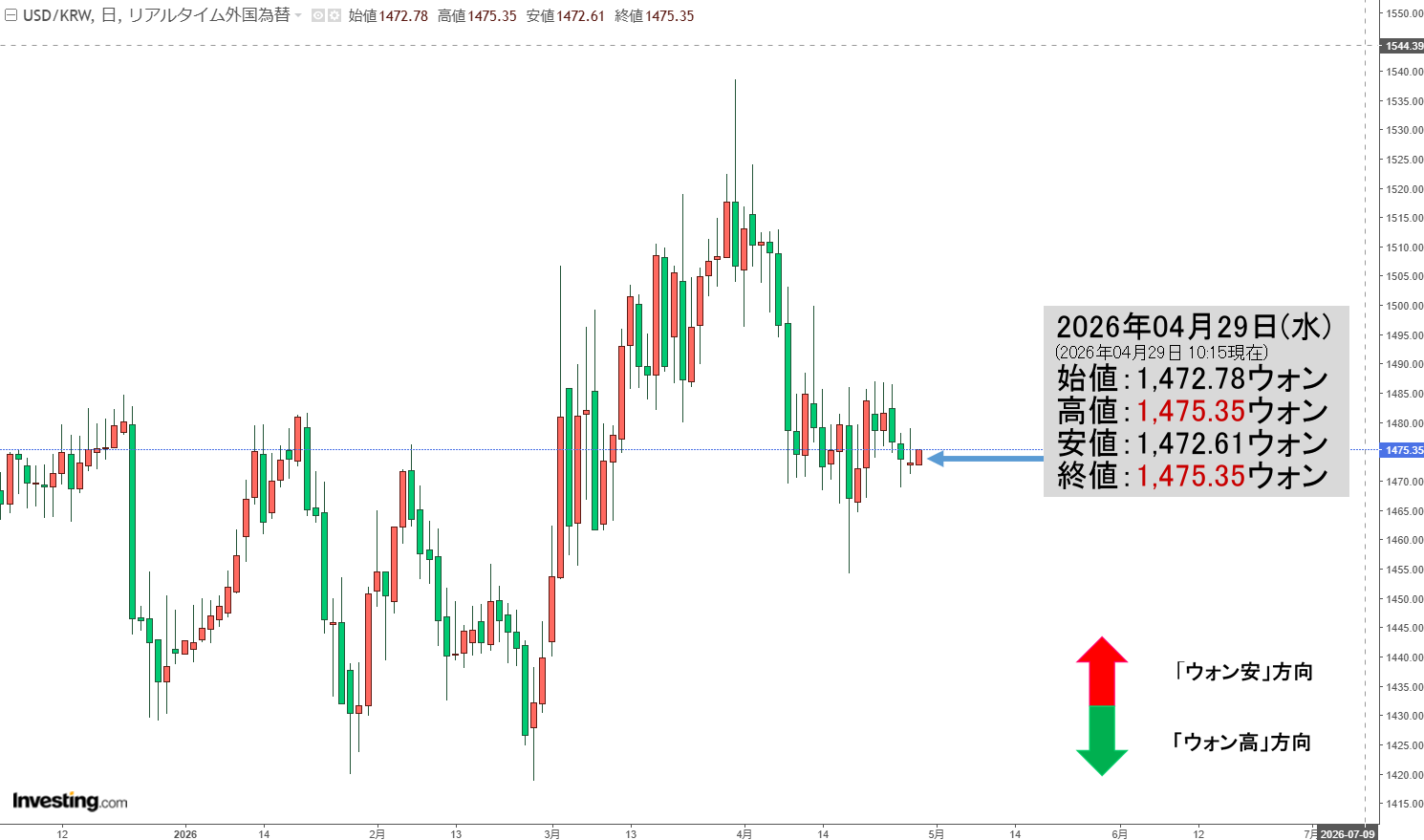 「ドルウォン」04月29日(水)初動・「1,475ウォン」陽線。 広告 トピック X Facebook はてブ Pocket LINE コピー 2026.04.29 おススメ記事 『Money1』 韓国産の剽窃アニメ『テコンV』のフィギュアまで登場!⇒ 50周年記念だが「マイイレージでGetしてね」理由は切実な負債。 『Money1』 【米韓正面衝突!】韓国与党『共に民主党』議員ら88人が「米国政界の韓国司法権侵害・内政干渉を糾弾する」と表明 ⇒ 抗議文書を駐韓米国大使館に送付すると息巻く。 『Money1』 韓国「米韓の常設通貨スワップを締結するチャンスだ」 『Money1』 韓国産業通商資源部「『サムスン電子』でストライキを起こすとは何事か! お前らちょっとは考えろ」 『Money1』 韓国自動車『現代』『起亜』のシェアは低下している ⇒ 中国では1%ない。 『Money1』 韓国軍「お金がないので」KF-21の戦力化を4年も後ろ倒し。 『Money1』 韓国『サムスン電子』が中国家電販売から2026年中にも撤退。 『Money1』 在韓米軍司令官「2029年2Qまでに戦時作戦統制権の移管条件が達成されるように進める」 『Money1』 韓国『起亜自動車』営業利益「-26.7%」⇒ 『現代自動車』と同じく売上微増で利益急減。 『Money1』 韓国の年金負担は急増する「2050年にはGDPの41.4%」⇒ G7の3.5倍 『Money1』 中国版「日本から軍靴の音が聞こえる」⇒ 日本の「新型軍国主義」が勢いを得て脅威を増している。 『Money1』 韓国「ナフサなど確保された在庫は1カ月分」⇒ 赤色警報はアスファルトの需給 『Money1』 韓国は米国下院共和党議員54人怒りの「公開書簡」に直面した ⇒ 李在明の謝謝外交で正面衝突。 『Money1』 韓国「日本から軍靴の音が聞こえる」 『Money1』 『IMF』が韓国に警告し、韓国大統領府の政策室長は「政府負債比率が63%に到達しても韓国は大丈夫だ」と強弁。 『Money1』 韓国「大統領府の釈明」が悲惨 ⇒ 米国と揉めていると認めた。安全保障協議が遅延していることも事実 『Money1』 韓国・日本の武装強化に文句「戦犯国のくせに」⇒ 日本人だったことを「なかったことにする」 『Money1』 あれ? 中国から王毅外相が来ないぞ ⇒ 「台湾にも謝謝 中国にも謝謝」の李在明に特大ブーメラン! コウモリはこうなる 『Money1』 韓国『サムスン電子』労働組合が「成果給上限の廃止」を要求 ⇒ ばかな国だなあ。 『Money1』 韓国産業通商資源部のリリースには「日本にたかる発言がない」 『Money1』 韓国は7アウト ⇒ 米国は怒っている。 『Money1』 【日本にたかる韓国】韓国政府の通商交渉本部長が 「日本の余剰石油を韓国のタンクで保管すればいいじゃん」と主張。 『Money1』 韓国の外貨預金・過去最大157.3億ドル減少。 『Money1』 韓国『現代自動車』2026年1Q 営業利益が30%急減! 『Money1』 韓国『SKハイニックス』2026年1Q:売上3倍、営業利益5倍、利益5倍。創立以来最大「営業利益37.6兆」絶好調な業績を叩き出す 『Money1』 韓国外交部「米韓関係には何も問題ありません」⇒ 米国に対する「報復措置」にはだんまり。 『Money1』 韓国政府は「エネルギー・鉱物スワップ」を検討している ⇒ 韓国精油業界の供給の影響力は大きいから交渉カードに使える。 『Money1』 韓国・北朝鮮情報を米国から制限されて逆ギレ「報復もあり得る」 『Money1』 『韓国銀行』李昌鏞総裁、離任「最後の挨拶」。 『Money1』 韓国外交部「春の例大祭・靖国神社120人超の議員参拝」に早速文句。 『Money1』 韓国は世界屈指の「ベンツが売れる国」 『Money1』 【韓国博物館】全部「中国のもの」じゃねえか――と韓国で物議を醸す。 『Money1』 韓国「ガソリン価格」まだまだ上昇中! 『Money1』 韓国『国民の力』党首「訪米して誰に会ったか」語らず。 『Money1』 韓国・李在明がインド訪問「首脳会談」⇒ 『ポスコ』インドに11兆突っ込む製鉄所を造るetc. 『Money1』 【韓国必死の対米関税交渉】注目は05月05日の公聴会 ⇒ 『現代自動車グループ』が米国に貢献しているだろetc.意見書を提出。 Fact1 日本の誇る海洋資源調査船『白嶺』は先進技術の塊! Fact1 夏の甲子園、優勝校を最も多く輩出している都道府県とは? Fact1 今話題の「楽天ライオンズ」とは? Fact1 奇跡の毛色「白毛馬」とは? Fact1 全て勝つといくら? 競馬GI競走で勝利騎手がもらえる賞金とは? Fact1 平成仮面ライダーの意外すぎるモチーフとは? Fact1 発表から2日で大崩壊、鳴かず飛ばずに終わりそうなスーパーリーグとは? Fact1 日本人マスターズ挑戦の歴史。松山以前に最高位だった選手とは? Fact1 甲子園通算本塁打、最多の清原に次いで多く打っている意外な選手とは? Fact1 セレクトセールの高額取引馬が稼いだ金額とは? 2026年04月29日(水)の市場が開きました。10:15現在、ドルウォンのチャートは以下のようになっています(チャートは『Investing.com』より引用)。 現在のところ陽線で「1ドル=1,475ウォン」近辺の攻防となっています。 現在の天井は「1ドル=1,475.35ウォン」、天底は「1ドル=1,472.61ウォン」です。 また動きがありましたら、随時記事を制作し状況をご紹介するようにいたします。 (柏ケミカル@dcp) 広告