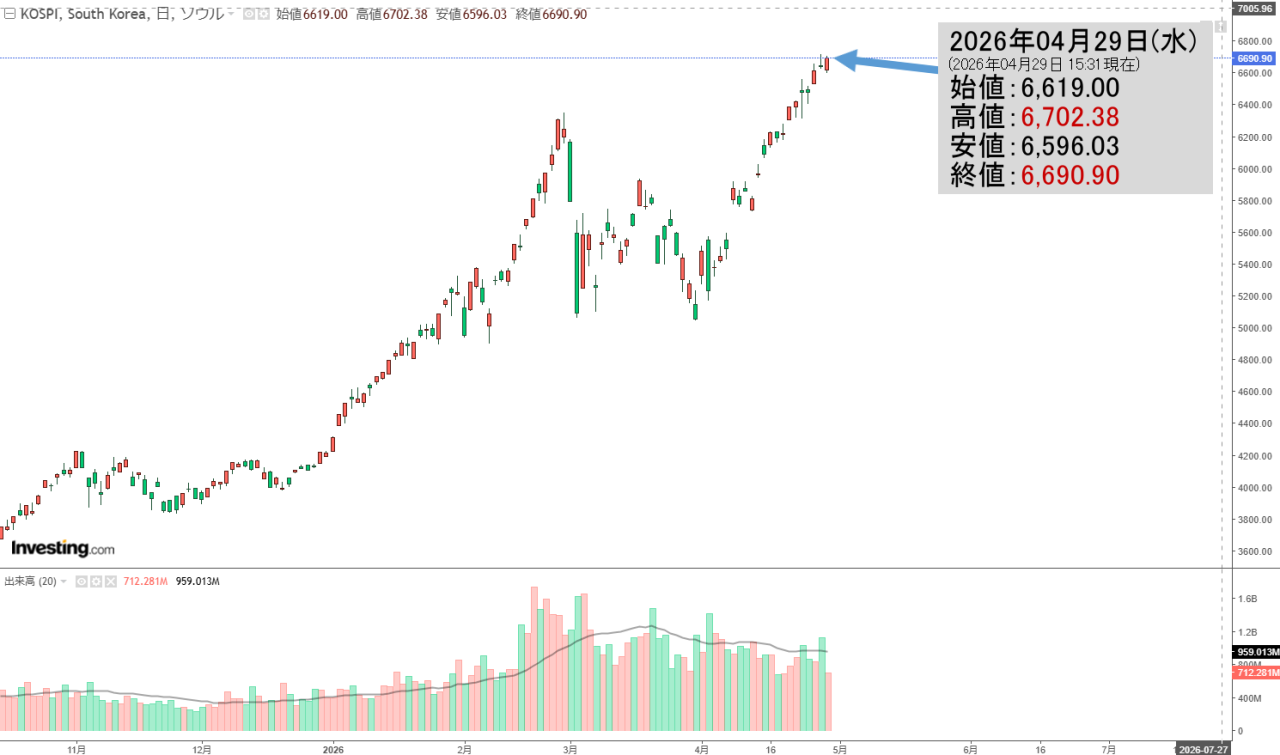 2026年04月29日(水)の韓国株式市場が締まりました。15:31現在、KOSPI(韓国総合株価指数)のチャートは以下のようになっています(チャートは『Investing.com』より引用)。