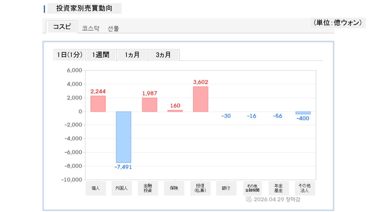 個人投資家は「2,244億ウォン」の買い越し、外国人投資家は「7,491億ウォン」の売り越しです。