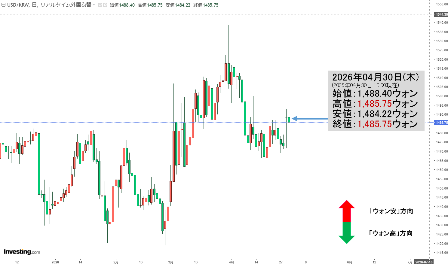 2026年04月30日(木)の市場が開きました。10:00現在、ドルウォンのチャートは以下のようになっています(チャートは『Investing.com』より引用)。