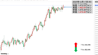 2025年12月17日(水)15:43現在、ドルウォンのチャートは以下のようになっています(チャートは『Investing.com』より引用)。すでに一時「1ドル=1,482ウォン」まで達しています。本日は韓国の通貨当局にとって「働きがいの...