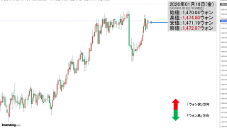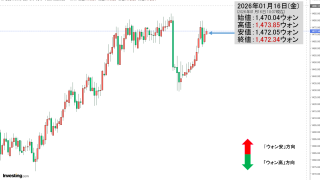 2026年01月19日(月)の市場が開きました。10:19現在、ドルウォンのチャートは以下のようになっています(チャートは『Investing.com』より引用)。上げて始まりましたが、現在のところ陰線。「1ドル=1,472ウォン」近辺の攻...