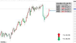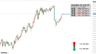 2026年01月13日(火)の韓国株式市場が締まりました。15:32現在、KOSPI(韓国総合株価指数)のチャートは以下のようになっています(チャートは『Investing.com』より引用)。陽線で終わりました。KOSPIは「4,692」...