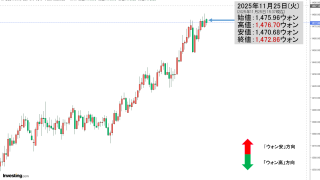 2025年11月25日(火)15:37現在、ドルウォンのチャートは以下のようになっています(チャートは『Investing.com』より引用)。正念場の天井圏の戦いなので一進一退です。現在のところ「1ドル=1,472ウォン」近辺の攻防となっ...