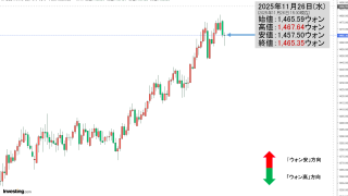2025年11月28日(金)の市場が開きました。10:00現在、ドルウォンのチャートは以下のようになっています(チャートは『Investing.com』より引用)。前日は陰線で締まり、本日は現在のところ陽線。「1ドル=1,465ウォン」近辺...