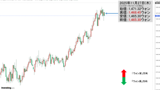 2025年11月27日(木)15:30現在、ドルウォンのチャートは以下のようになっています(チャートは『Investing.com』より引用)。底からは戻しましたが、現在のところまだ陰線。「1ドル=1,464ウォン」近辺の攻防となっています...