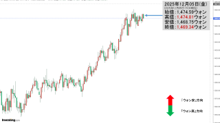 2025年12月05日(金)15:30現在、ドルウォンのチャートは以下のようになっています(チャートは『Investing.com』より引用)。陰線が伸びてまた「1ドル=1,470ウォン」割れです。現在のところ「1ドル=1,469ウォン」近...