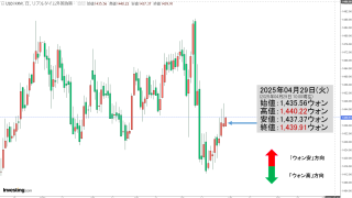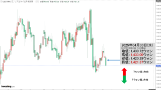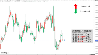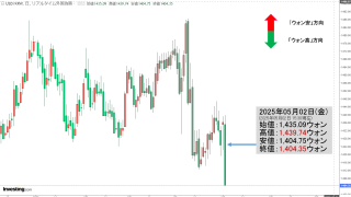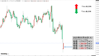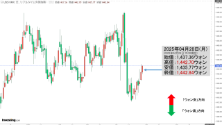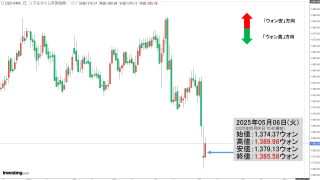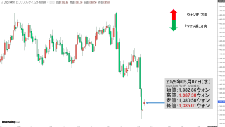 2025年12月09日(火)15:50現在、ドルウォンのチャートは以下のようになっています(チャートは『Investing.com』より引用)。ローソク足の上が削られました。現在のところ「1ドル=1,470ウォン」近辺の攻防となっています。...