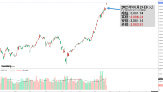 2025年06月24日(火)の韓国株式市場が締まりました。15:31現在、KOSPI(韓国総合株価指数)のチャートは以下のようになっています(チャートは『Investing.com』より引用)。やりました! 陽線が伸びて3,100を超えまし...