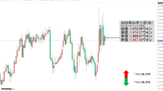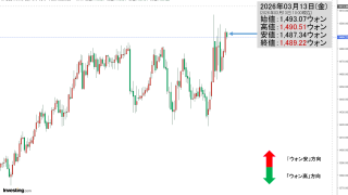 2026年03月13日(金)15:36現在、ドルウォンのチャートは以下のようになっています(チャートは『Investing.com』より引用)。ローソク足の調整が入りました。前日の終値は「1ドル=1,493ウォン」となり、本日がどこで締まる...
